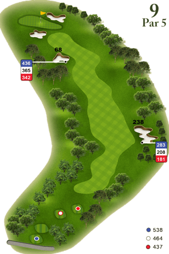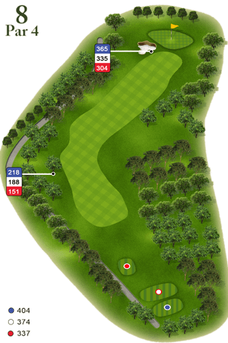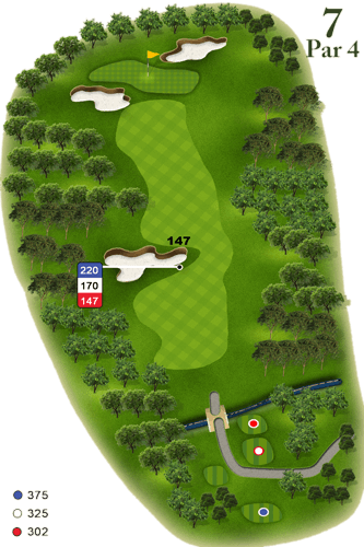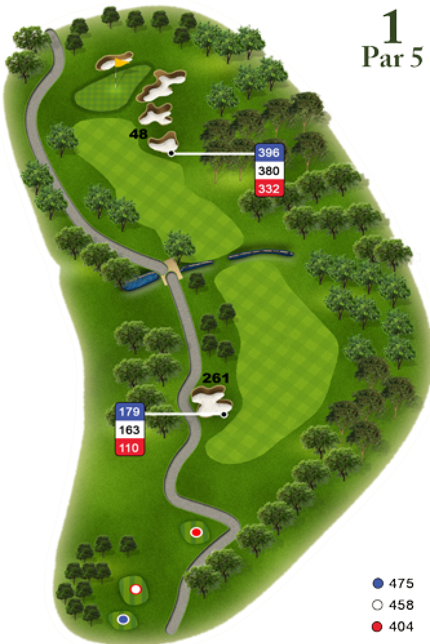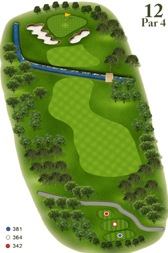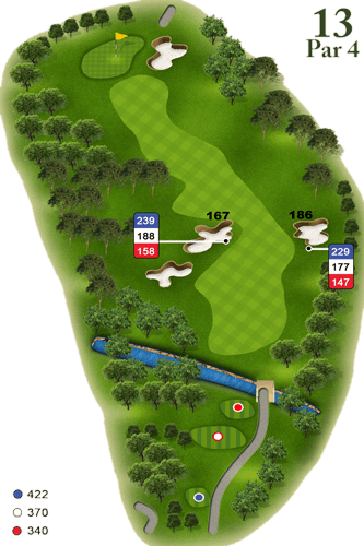 The bunkers left centre start about 175 yards from the green, so a good tee shot will clear them – resulting in a shorter approach. The safer play is to aim for the right hand side of the fairway. There is a creek 40 yards from the green which shorter hitters may decide to lay up to. The green is guarded by bunkers on the left and right. The green itself slopes from left to right and slightly from back to front.