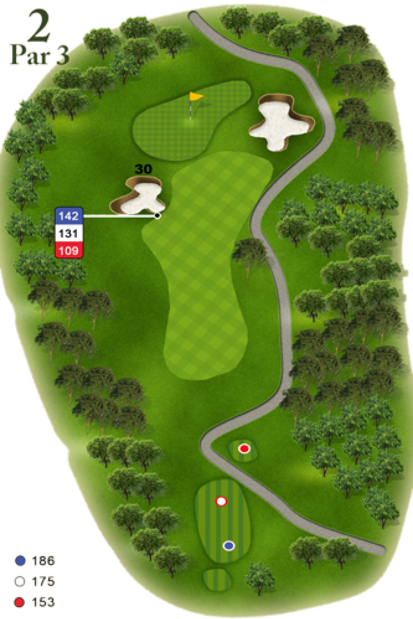 The first Par 3 and arguably the most difficult. The green is defended by a bunker front left which commences 45 yards from the green and ends 10 yards before the putting surface. There is also a greenside bunker on the right. There is O.B. on the left and impenetrable jungle on the right. The green slopes moderately from left to right and is deeper than it is wide.