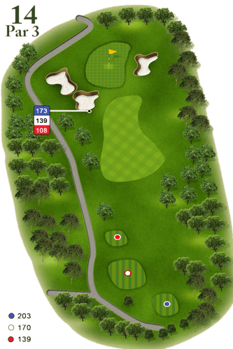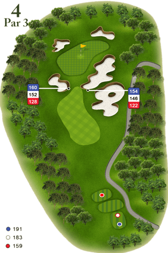 Your tee shot will pass through the gateway of Flame of the Forest trees to reach the deep green which is fairly narrow at the front and widens to the back. There is O.B. on the left. The green is well guarded by a deep bunker front left and a bunker front right. The green slopes moderately from right to left and slightly from back to front.